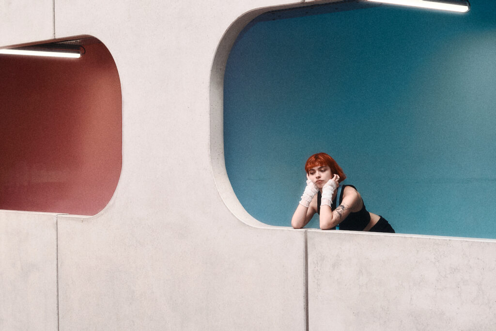 « Les photos de cette interview ont été faites dans le bâtiment 16 M de l’Université Pierre et Marie Curie à Paris, parce qu’on cherchait un endroit cohérent avec l’univers visuel du dernier projet de Surprise, SI Y’A UN MONDE. Et ce lieu permettait justement d’avoir toute une variété de couleurs, dans un style très futuriste et brutaliste. C’était assez intéressant visuellement et on pouvait rester dans des notes un peu froides, pour faire un petit rappel de la pochette du projet. Ce qui était assez particulier, c’est que je connais plutôt bien Surprise : j’ai fait toutes les photos de sa dernière sortie, que ce soit la pochette, les singles, ou les photos de presse. Donc il fallait que je la “regarde” différemment, dans le cadre de portraits pour une interview d’un média. C’était vraiment une manière différente de travailler avec elle et de la faire poser, on était sur quelque chose qui devait être beaucoup plus naturel, et c’était intéressant pour moi. Sur cette photo, je trouve qu’on ressent bien sa personnalité, et quel est son projet : elle est vraiment dans une sorte de moue de lassitude et une nonchalance dans sa manière de poser, et c’est un peu ce qui traduit le mieux qui elle est. J’aime bien aussi le fait que ça soit une photo au format paysage. Ça rend la structure plus massive autour d’elle, et je trouve ça vraiment cool. C’était intéressant d’écraser les perspectives dans un lieu aussi énorme. »