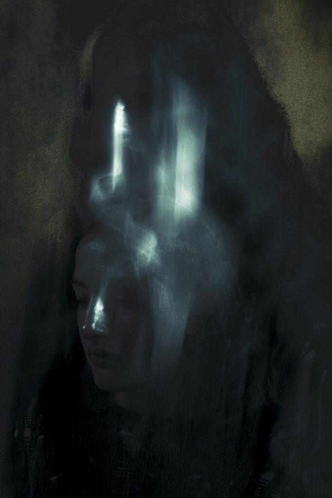 « On a fait ces photos avec Asinine dans un studio à côté de chez moi, le temps d’une heure, tout s’est fait de manière assez fluide. Sur cette série de photos et sur cette image particulièrement, j’aime bien l’idée de cette traînée presque fantastique qui émane de son visage, comme si quelque chose s’en échappait. Ça donne l’impression d’étirer l’âme de l’artiste, sans tomber dans quelque chose de trop littéral. Et je trouve que ce bleu représente bien le côté « électrique », parfois incisif, de la voix d’Asinine. Cet effet de flou sur cette image vient uniquement du travail de la lumière et du mouvement, réalisé en studio avec un seul flash, sans effet ajouté en post-production. La traînée de lumière sert aussi à estomper les contrastes et à éviter un portrait trop frontal, trop classique. Avec un pote, on a aussi peint un fond blanc pour obtenir un rendu un peu pictural à l’arrière d’Asinine, avec du grain et une couleur assez sombre. Ça permettait ensuite de l’éclairer et de la placer au centre de l’attention. Ce qui était important pour moi, et c’est aussi le cas dans toutes mes photos, c’était qu’on ne puisse pas forcément situer temporellement et spatialement la photo. Comme un fragment de souvenir coincé quelque part. »