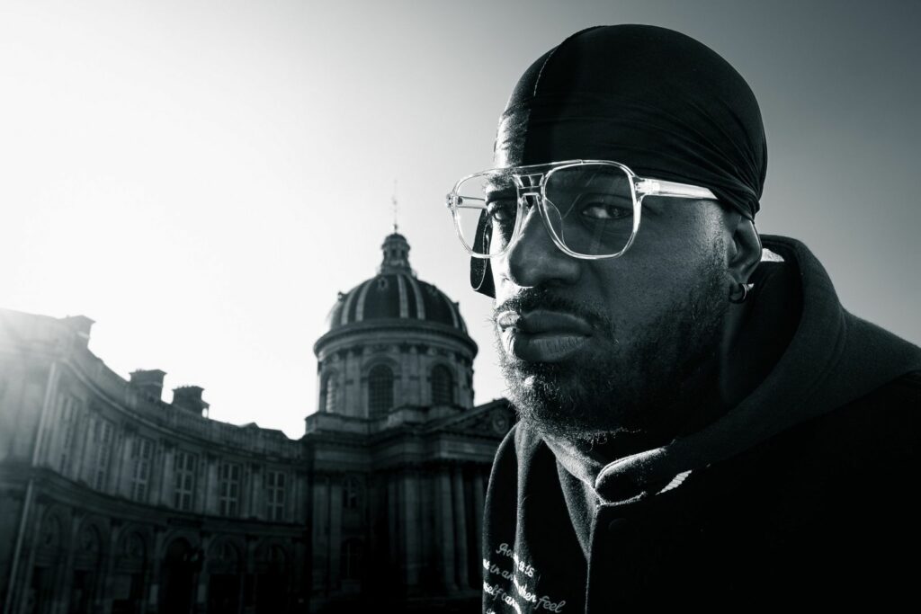 « Nous avions décidé de faire des photos devant l’Académie Française en référence à l’Académie du Hip-Hop, la structure fondée par Grödash. Je connaissais ce bâtiment mais je n’avais pas fait de repérage en amont du shooting, et je n’avais jamais remarqué sa forme en U, qui lorsque je suis arrivé sur place m’a donné envie de tenter des trucs au grand-angle. Les focales que j’aime le plus sont 35mm et 23mm, je les utilise quasiment tout le temps car je trouve qu’elles retranscrivent les choses naturellement. Tout le shooting a donc été fait entre ces deux focales, ce qui me permettait d’être à une distance naturelle de Grödash de sorte à ce que je vois par mon œil soit quasiment fiable à ce qu’il y a dans l’objectif. Nous avons pris les photos en milieu de matinée, le temps était idéal, avec une de ces belles lumières d’hiver par journée fraîche, ce qui d’ailleurs n’a pas manqué de ramener beaucoup de touristes. Pour cette photo, j’étais en légère contre plongée pour éviter qu’on les voit et ma volonté était d’aligner la courbe du bâtiment et celle de la barbe de Grödash, ce qui créait quelque chose de dynamique au niveau des lignes. Son visage étant très expressif, quand je l’ai vu dans ce cadre, ça m’a rappelé les personnages de Snatch, film où des effets visuels de ce style donnent un ton comique. J’ai alors dit à Grödash : « regarde-moi comme si tu m’avais mis dans un coffre et que tu t’apprêtais à le fermer. » Cette attitude, l’angle, et le jeu de lumière sur ces lunettes à monture transparente, cela a donné un moment parfait. Le meilleur portrait que j’ai fait cette année, et peut-être mon meilleur portrait tout court. Une photo dont je suis toujours aussi content en la revoyant. »