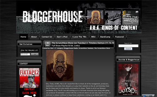 En fin d'année 2009, les blogs "When they Reminisce...", "WakeYourDaughterUp" et "Poisonous Paragraphs" ont fusionné pour donner naissance à Bloggerhouse.net, dont l'équipe s'apparente un peu à une dream team spécialisée dans le rap sac à dos. Les garçons ont une culture Hip-Hop immense et écoutent à peu près tout ce qui sort et est sorti dans leur crédo. Alors certes, il y a parfois un peu de tri à faire dans la multitude de sons proposés, mais Bloggerhouse.net n'en demeure pas moins un support très précieux pour se tenir au courant des nouveautés. D'autant que le site propose chaque semaine une émission de radio de 4 heures, "The Scrunchface Show", histoire de nous mâcher encore un peu plus le travail.